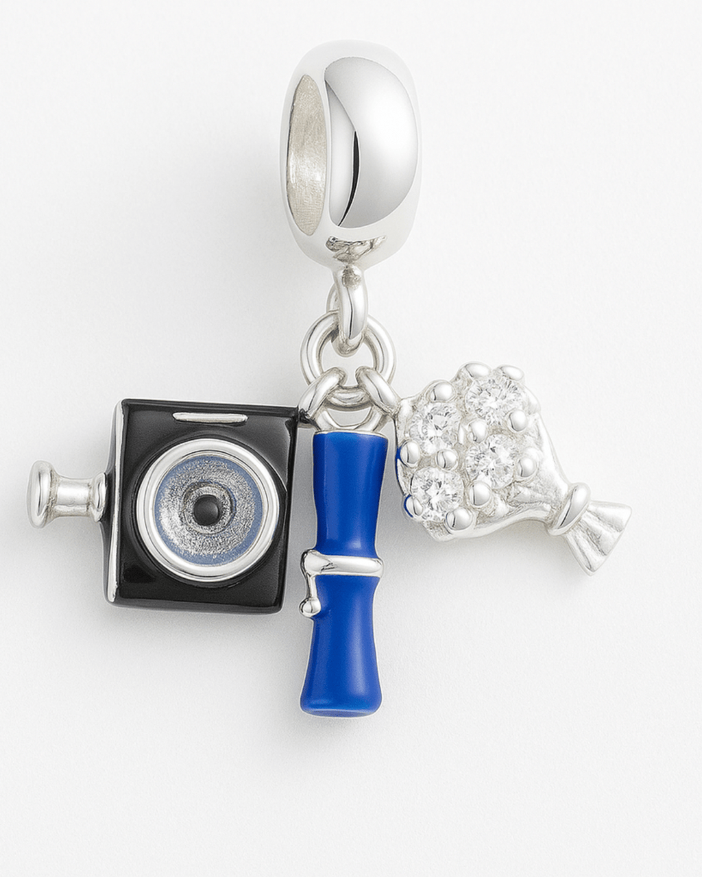 • 1 Berloque Triplo Formatura com Zircônia e Resina em Prata 925.<br>